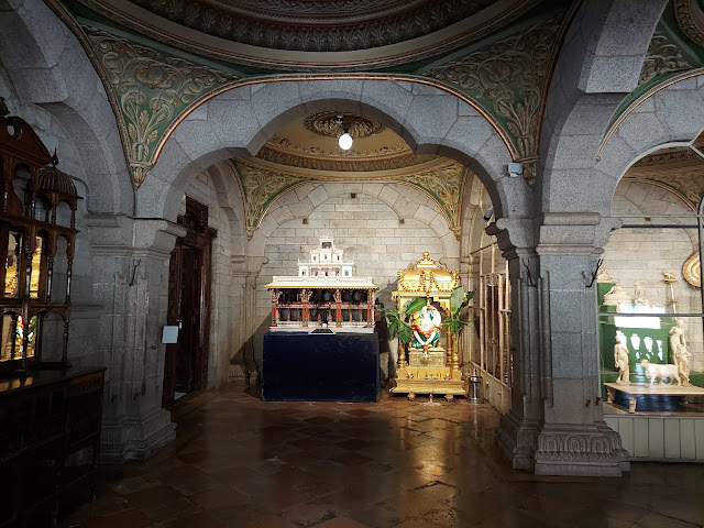 After passing through the intricately crafted silver doors and the life-size plaster statue of Maharaja Krishnaraja Wadiyar, one reaches the Public Darbar Hall called Diwan-i-Aam. The majestic rectangular hall displays many priceless collections of paintings by great artists, including Raja Ravivarma. It has an expansive balcony supported by massive columns tastefully painted in pleasing colors. The golden throne kept in the octagonal pavilion on the western end of the hall is a significant highlight of the entire palace.